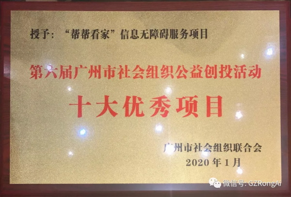 由广州市残疾人福利基金会和广州市融爱社会服务中心开展的“帮帮看家”信息无障碍服务项目,荣获第六届广州市社会组织公益创投活动“十大优秀项目”。