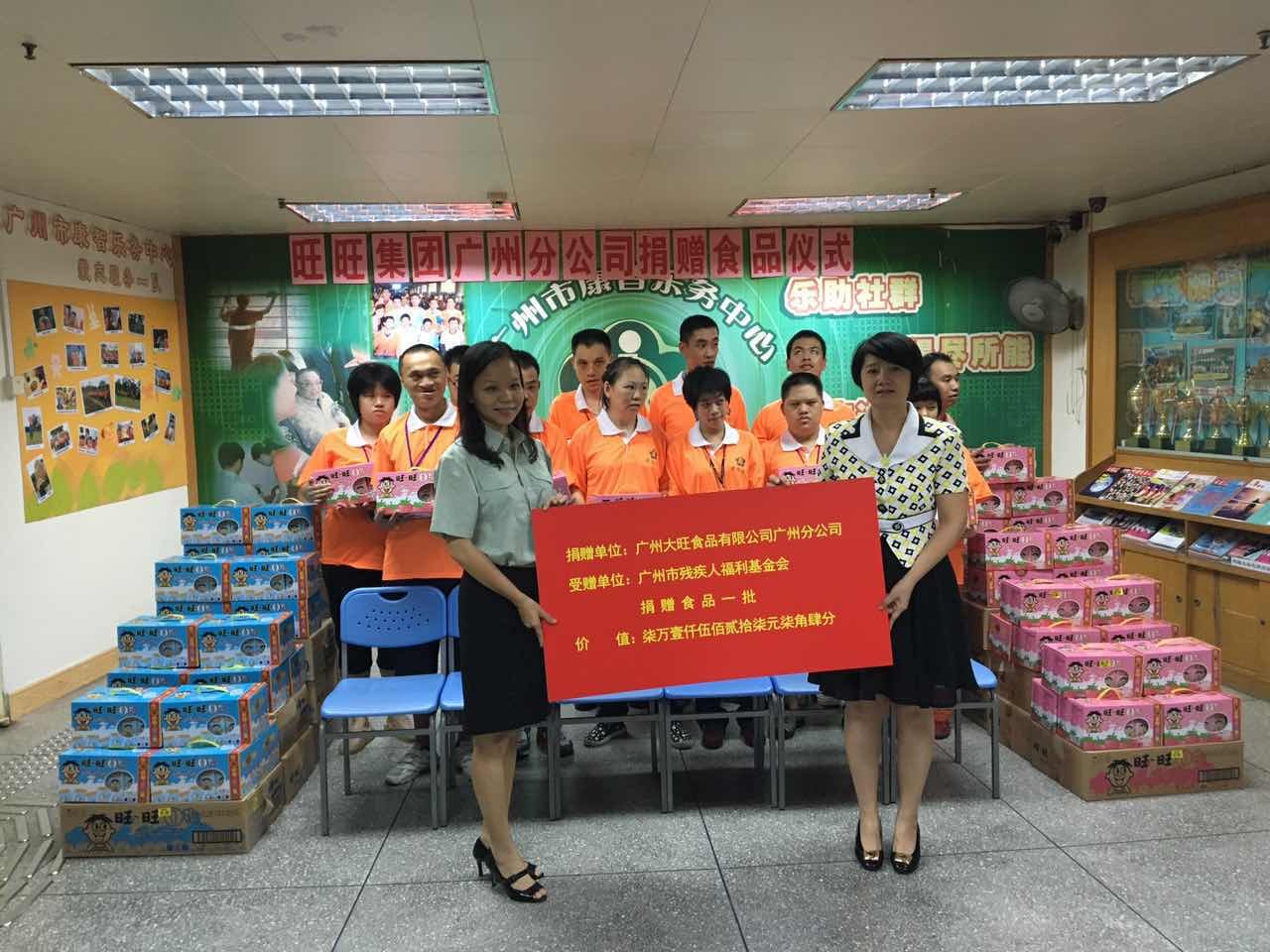 8月16日,旺旺集团广州分公司向广州市残疾人福利基金会捐赠800多箱旺旺O泡果奶饮料,价值人民币7万多元,为广州市各残疾人福利机构的残疾人送上祝福。