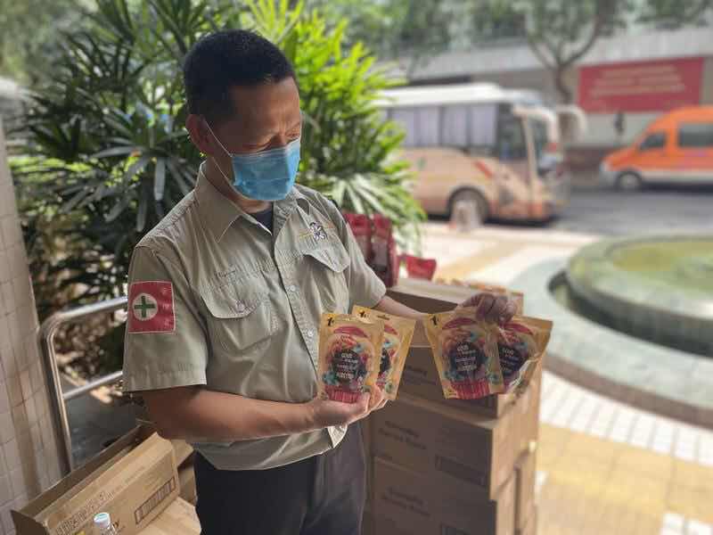 17日上午,在广州市残联办公楼楼下,多名身着统一橙色服装的广州康智乐务中心的学员们正在协助现场工作人员搬运爱心企业捐献的糖果。记者了解到,旺旺集团通过其下属广州祥旺食品有限公司和广州旺旺食品有限公司向广州市残疾人福利基金会捐赠一批价值约71万元的酸圈糖和北欧莓糖,共计超7600箱。据悉,这批爱心食品将派发给广州市残疾人展能中心、安养院、体育运动中心、就业培训中心,广州康复实验学校、广州市康纳学校,广州市残联人各专门协会等机构,惠及全市约1.5万名残疾人。一位收到捐赠品的广州市残疾人展能中心学员表示:“刚返来中心复训就有爱心企业派糖给我们,好开心!好多谢!”