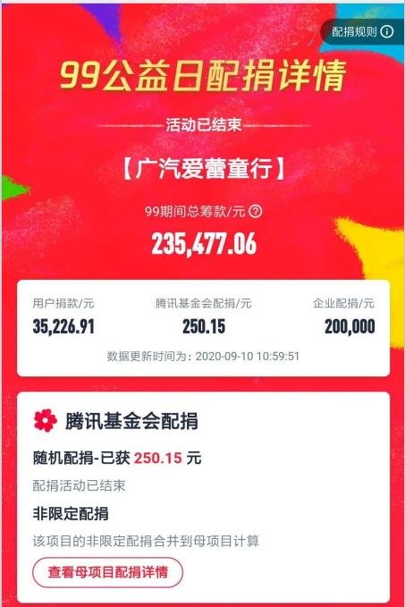 9月7日至9日,广汽集团联合广州市慈善会和广州市残疾人福利基金会在腾讯公益平台99公益日发起三个公益慈善项目爱心捐款活动,广汽集团为爱心捐款进行5倍叠加配捐,实现“您每捐1元 广汽陪您捐5元”,让大家的爱心放大5倍!