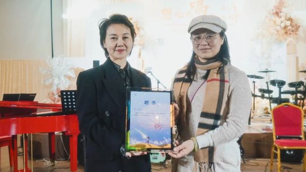 广州市残疾人福利基金会副秘书长谢淑婷女士(右)为追梦天使艺术团艺术总监徐熙乔(左)颁发新一任聘书